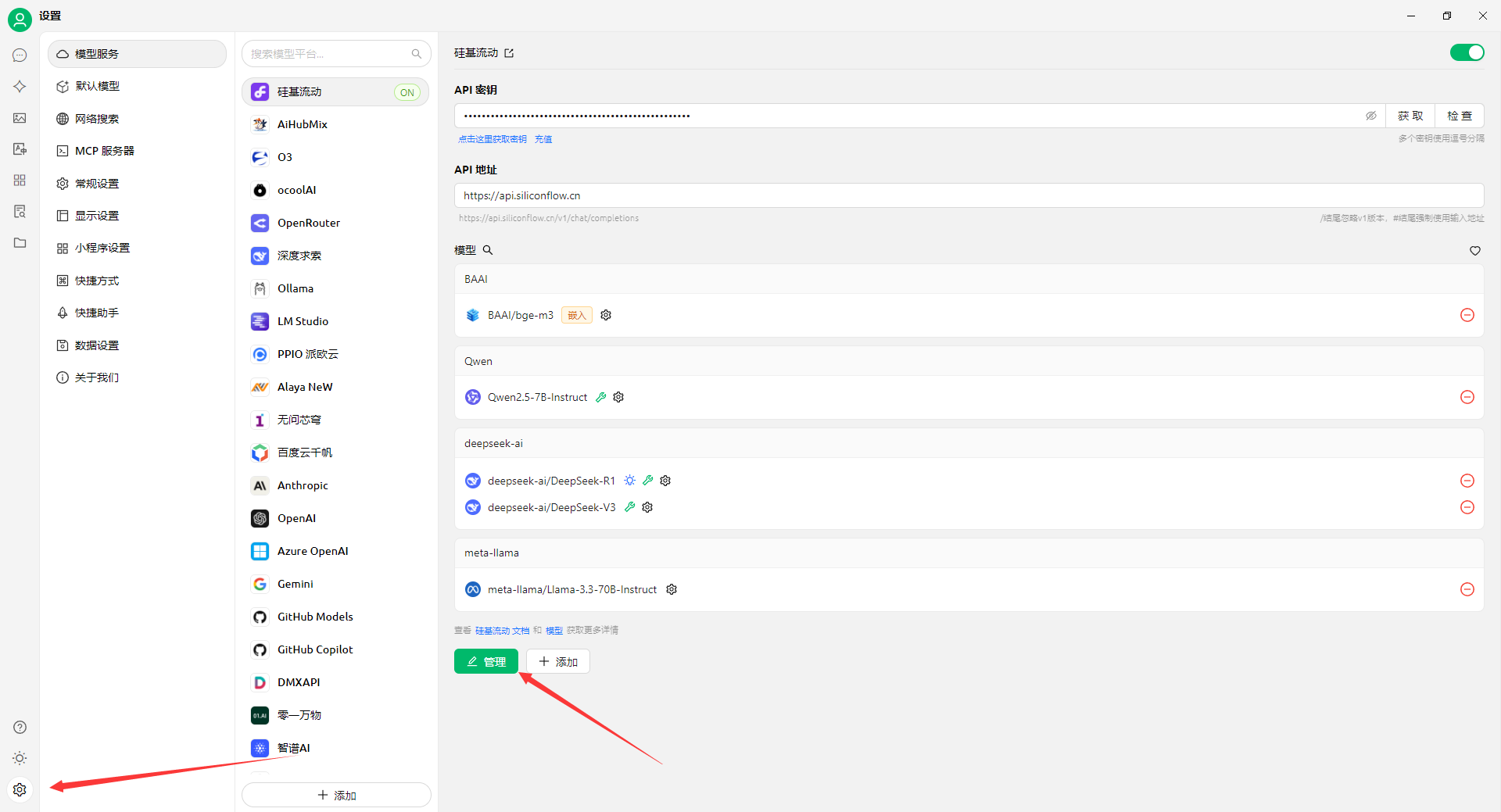 3、 当你创建完一个角色后,你需要点击左边栏的“设置” → 点击“管理”来添加你的嵌入式模型。