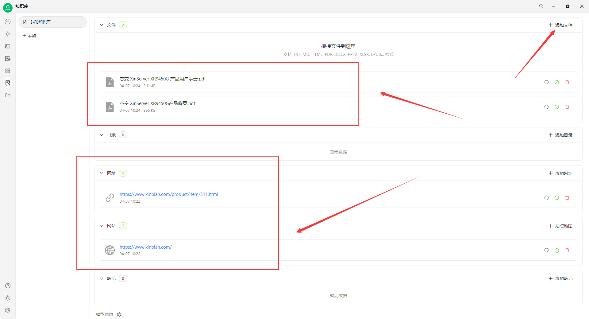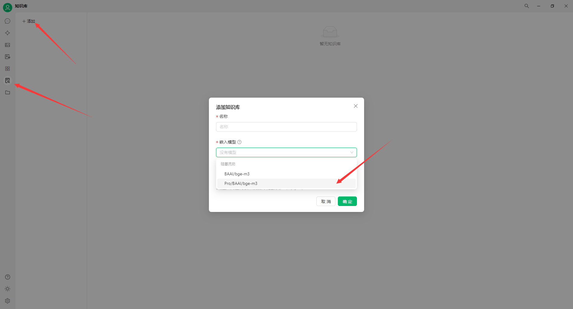 5、 完成后点击“X”退出 → 点击左边栏的“知识库” → 点击添加知识库 → 选择嵌入模型“Pro/BAAI/bge-m3” → 给你的知识库命名 → 点击“确定”→ 然后把你想要让AI助手学习的各种资料都上传给他(可以是PDF、PPT、Word、Excel、txt、网站、网址等各种信息)
