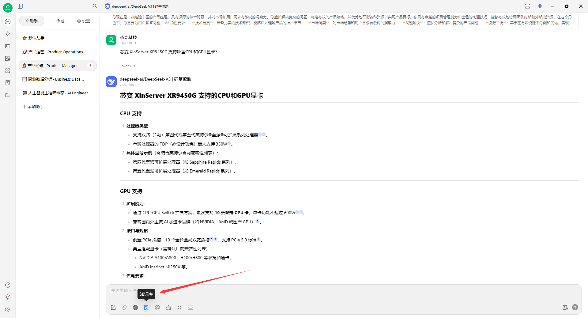 6、 回到你最初创建的助手,点击下方的“知识库”选择你添加进数据和资料的且以命名的知识库。现在你就可以真正开始使用你的私人助手了。(比如我上传了产品的规格书、价格体系、产品兼容列表,我就可以让我的自认助手来帮我做产品配置和报价了)如下图:
