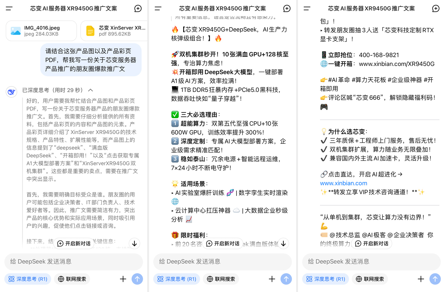 如下图我把公司的产品宣传图和彩页上传DeepSeek后,告诉他“请结合这张图片以及产品彩页pdf文件,帮我写一篇关于芯变服务器产品推广的朋友圈爆款产品推广文”你就可以得到一篇令人惊喜的微信朋友圈/小红书的爆款产品推文了。