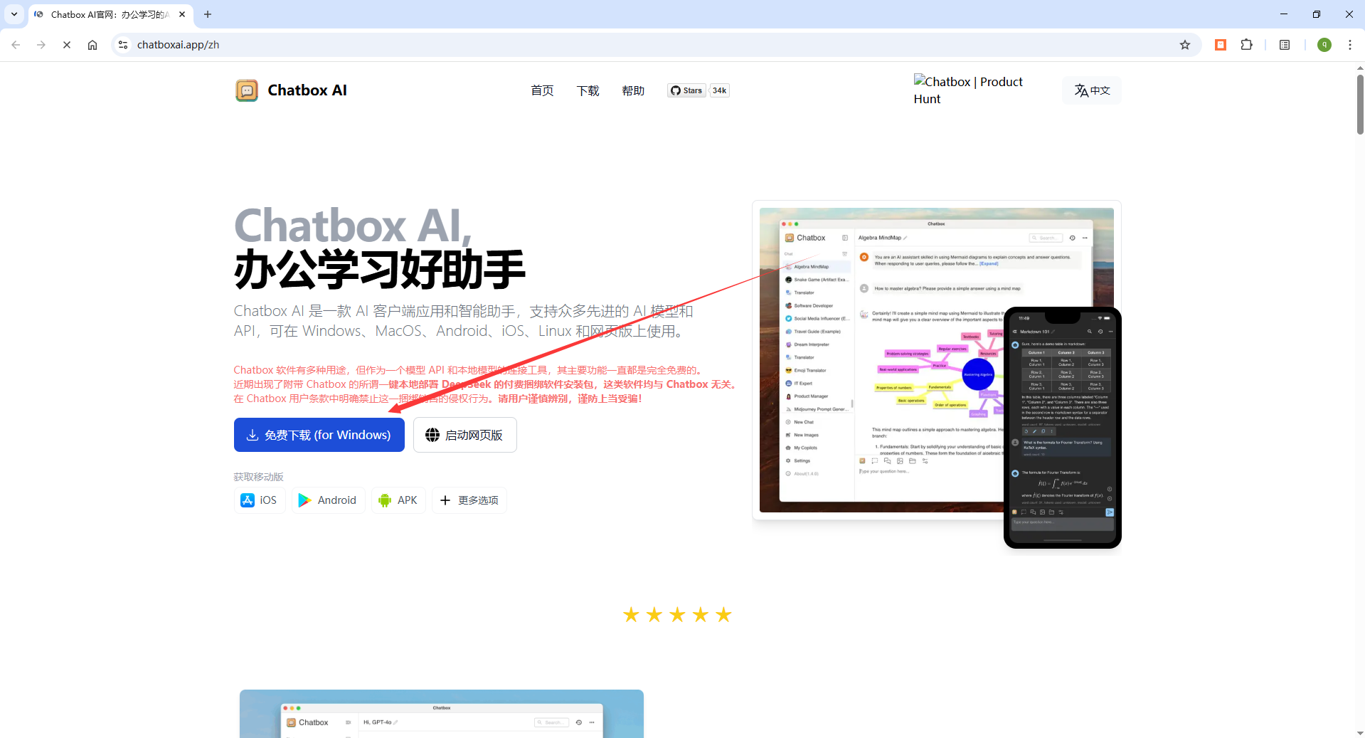 打开Chatbox AI官网,点击免费下载,下载到本地之后直接点击安装即可(如下图)
