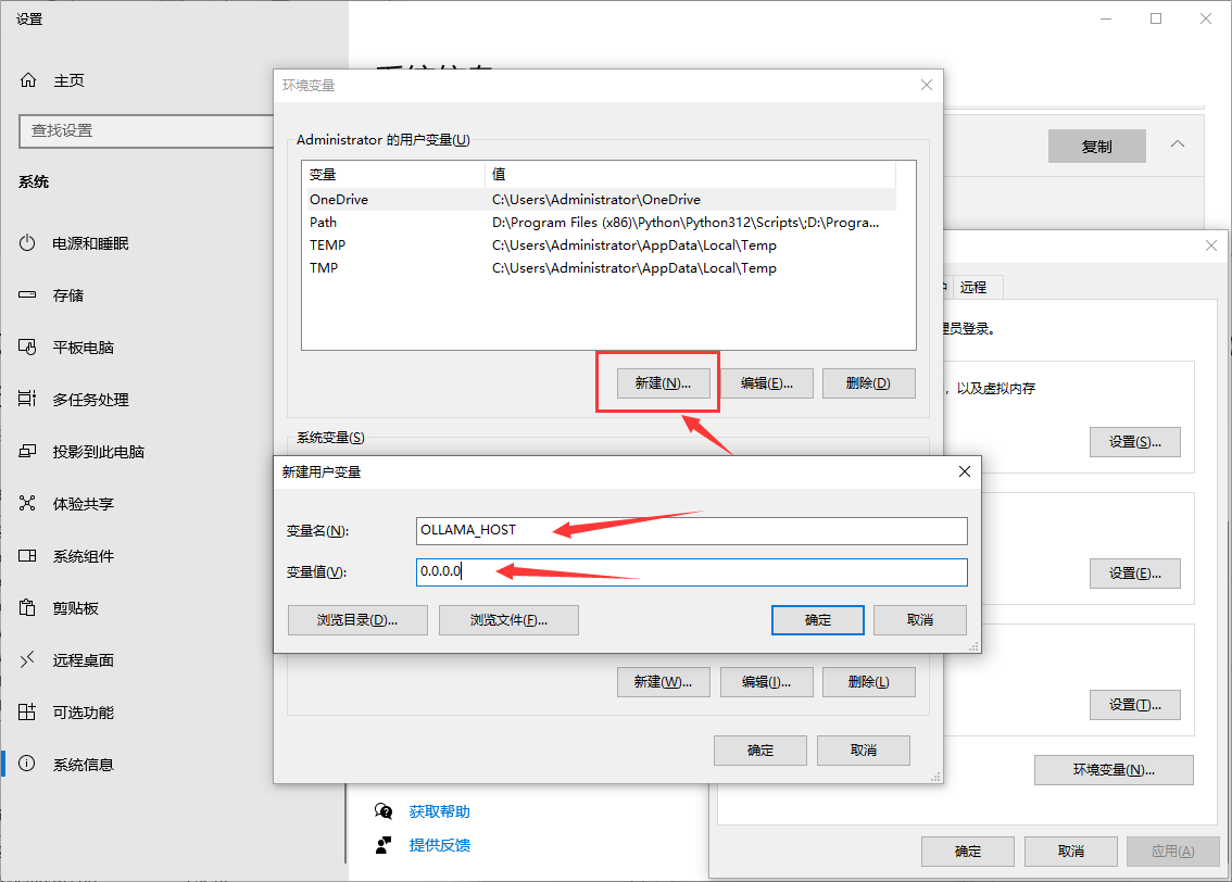 在环境变量界面单击”新建“按钮,然后新建第一个用户变量:OLLAMA_HOST,变量值是:0.0.0.0,单击确定
