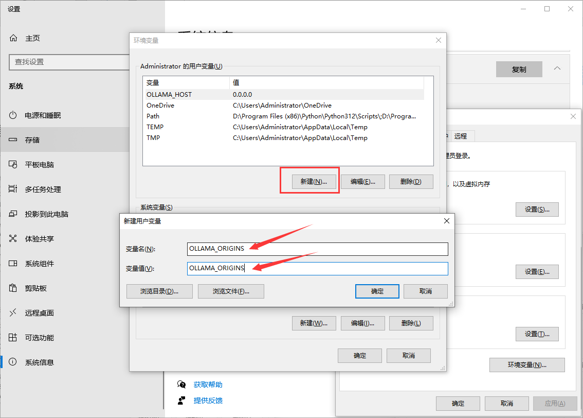 新建第二个用户变量:OLLAMA_ORIGINS,变量值是:OLLAMA_ORIGINS,单击确定。