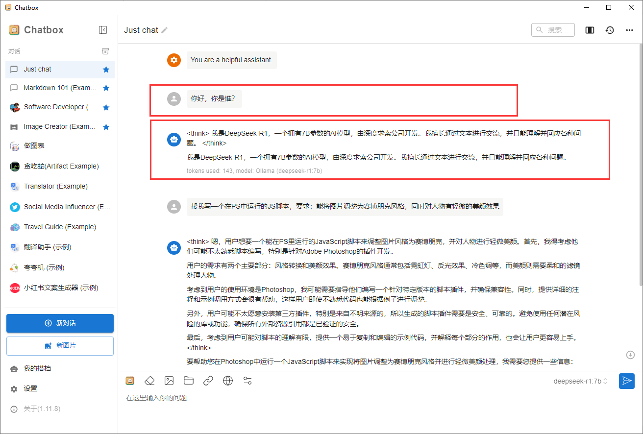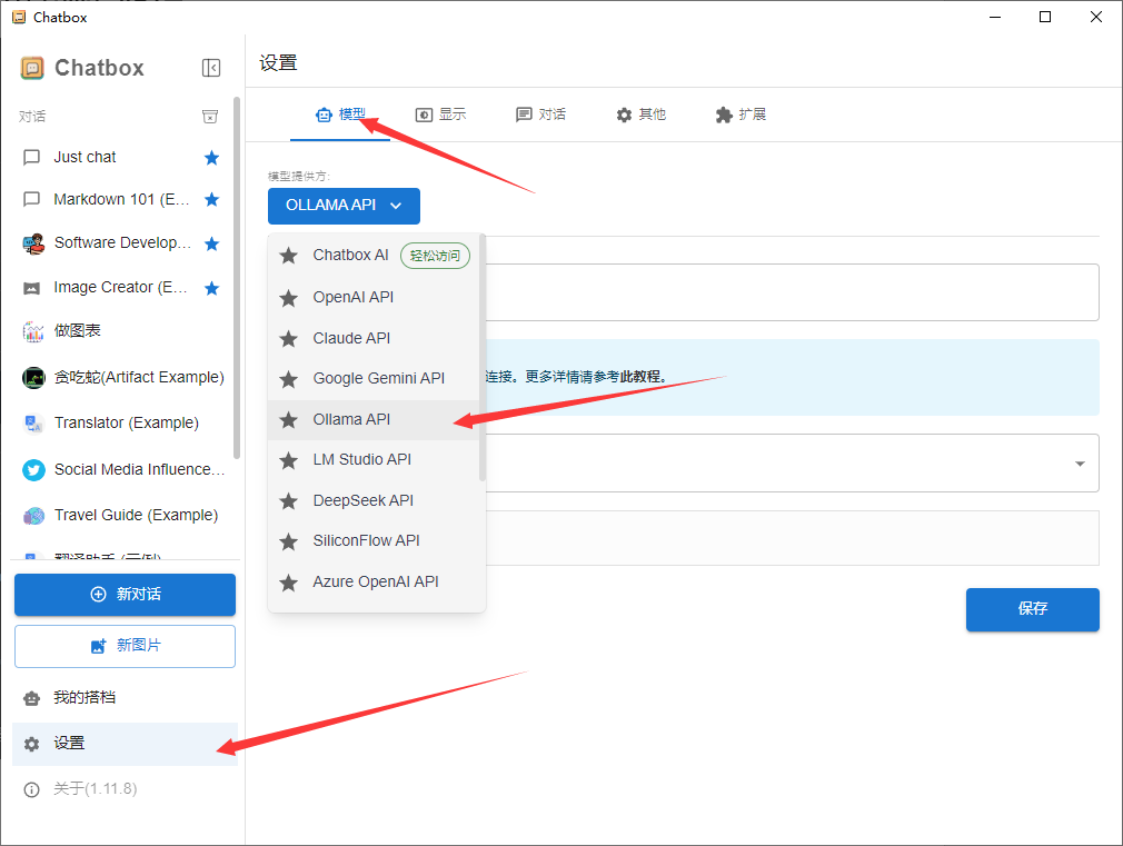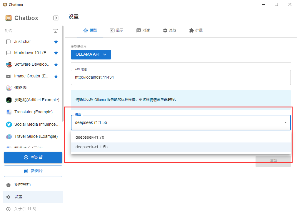 下面模型选择,之前安装的模型:deepseek-r1:7b,点击保存
